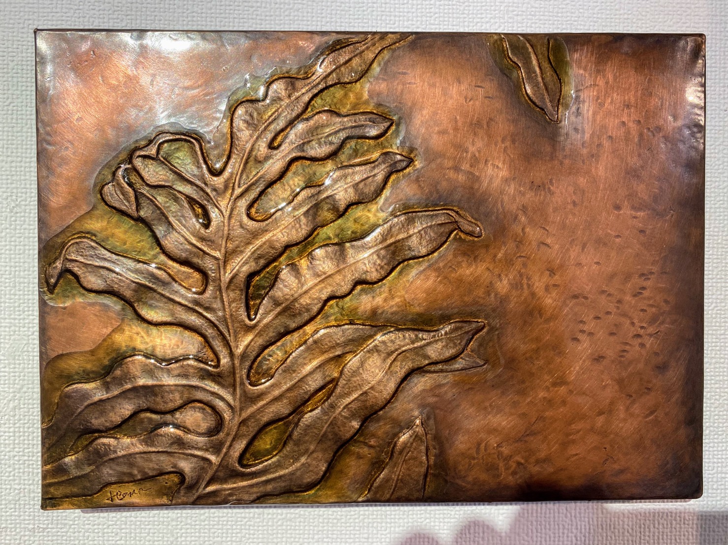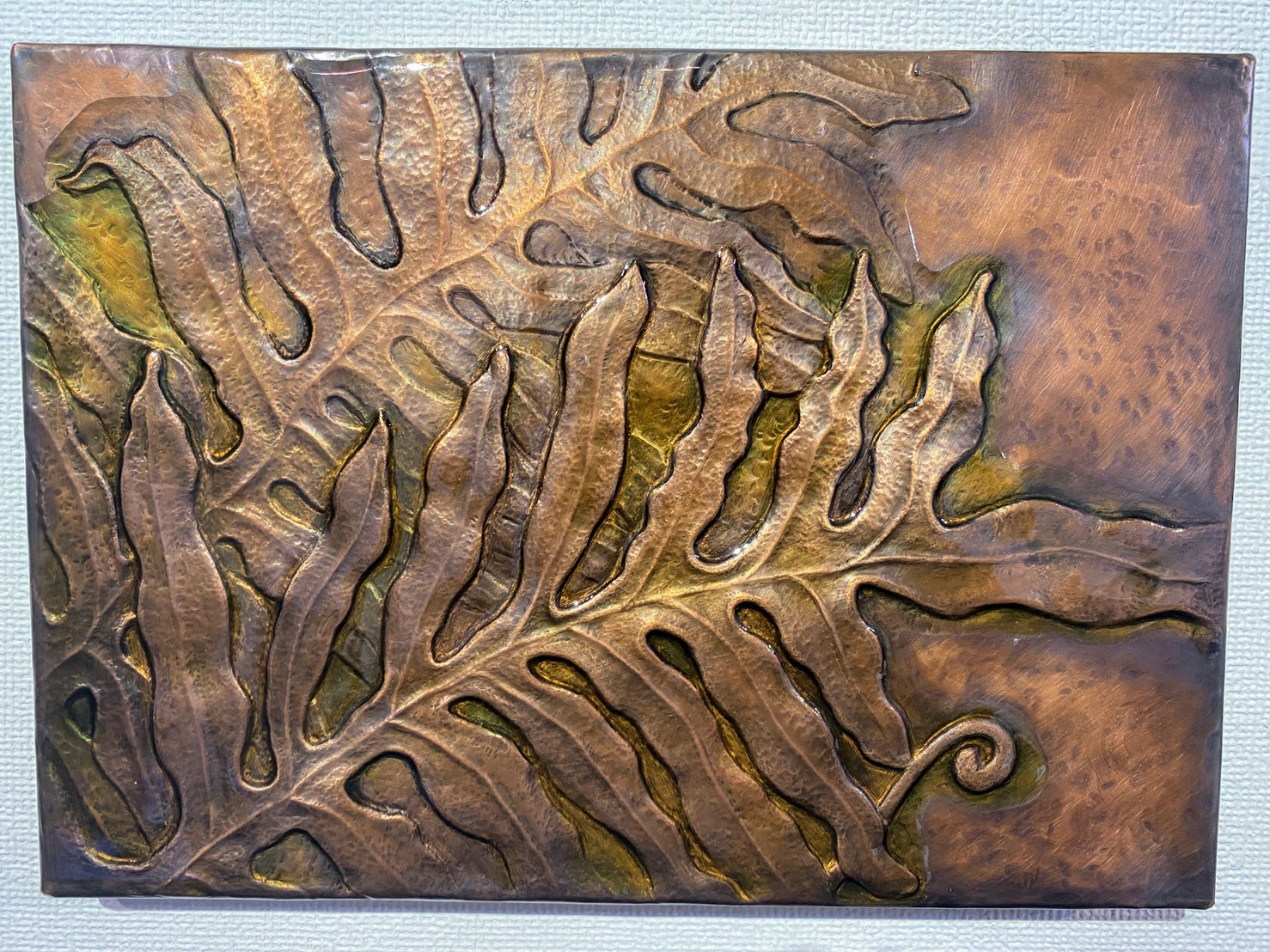 2枚組の壁掛け「シダ」には、薄く緑色の樹脂を乗せました。色とはいっても、奥に銅を感じさせることがとても大切です。