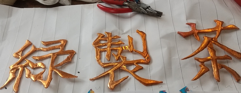 紙に書いた文字が、重なり合って立体になることはありませんが、鍛金という技法で立体的に表現しています。